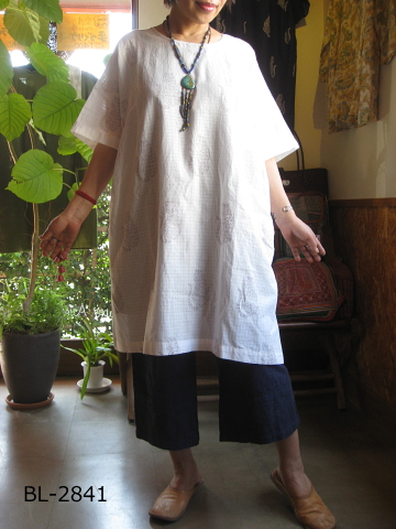 大人の夏に 涼しい インドコットン NEKO NYAN TUNIC さらりとした肌触りが心地いい〜格子織りのインドコットンで 涼しく過ごしましょう 手描き風のねこニャンの後姿が可愛い大人のチュニックブラウス届きました♪