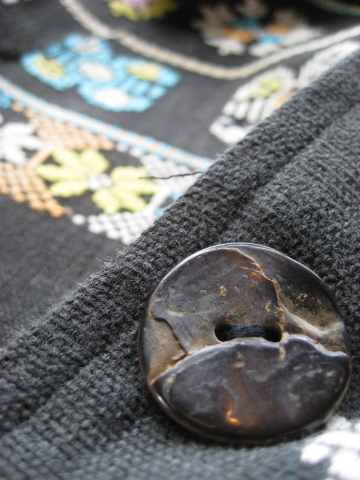 | * 時を経て穏やかに馴染んだ黒炭色の普通地厚の綿布 シックで素敵 * 白・ピンク・黄色・緑・水色・オレンジなどのアジアンカラーの色糸模様 |