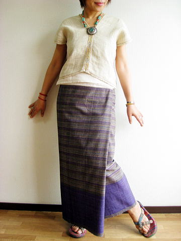 タイ北部の綿の産地「ジョムトン村」の布で作った 北タイスタイルの筒型スカートパーシン パーシンは筒型に縫い合わせた大きな1枚の布に体をすっぽり入れて 前で布を畳み腰布を折り返す、ゆ〜ったりアジアな雰囲気が魅力♪