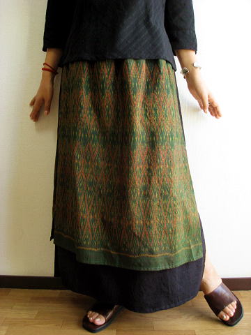 *ウエスト総ゴム入りフリーサイズ〜黒地のオールドシルクに彩りの絹絣マットミーを重ねたスカート*